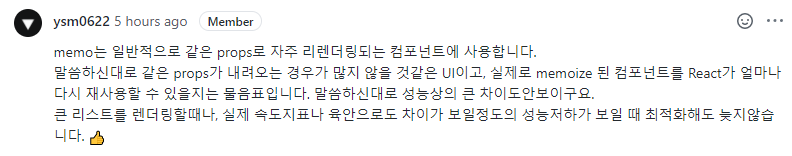 이전 미션에서 성급한 최적화에 대해 알게 됐다. 메모이제이션과 props의 얕은 비교도 결국 비용이기 때문에 단순히 리렌더링 횟수를 줄이기 위해 사용해서는 안된다는 것이 주요했다. 사용자가 체감할 수 있을 정도의 속도 변화 혹은 직접 테스트를 하여 유의미한 성능 차이를 확인할 때 도입해도 늦지 않다.