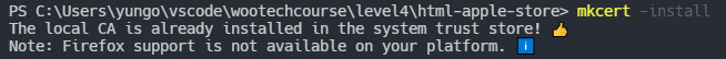 설치가 완료됐다면 https를 적용할 프로젝트의 최상위 디렉토리에서 mkcert -install을 실행시켜줍니다.