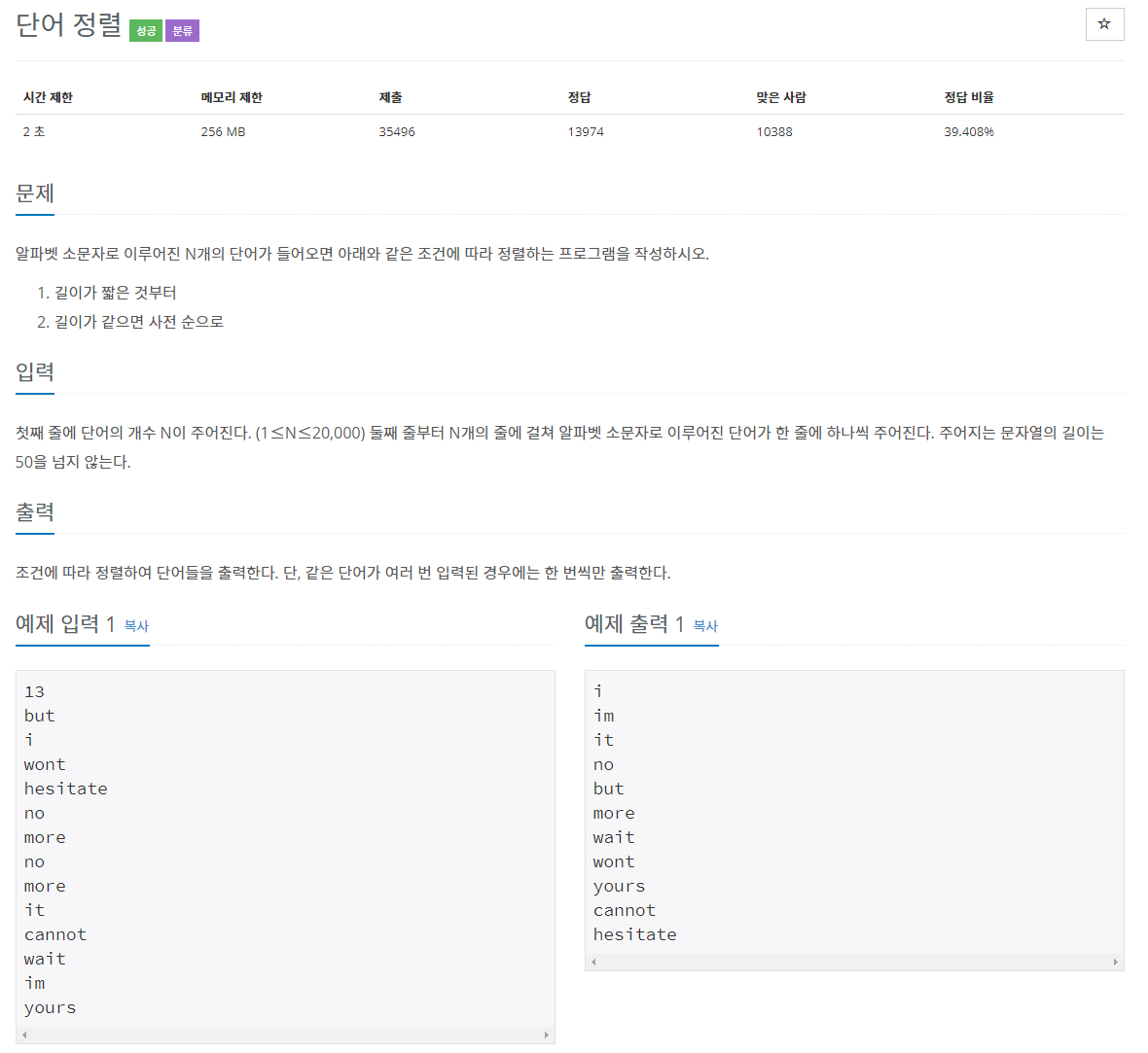 # 단어의 길이로 정렬 + 길이가 같은 경우 사전순으로