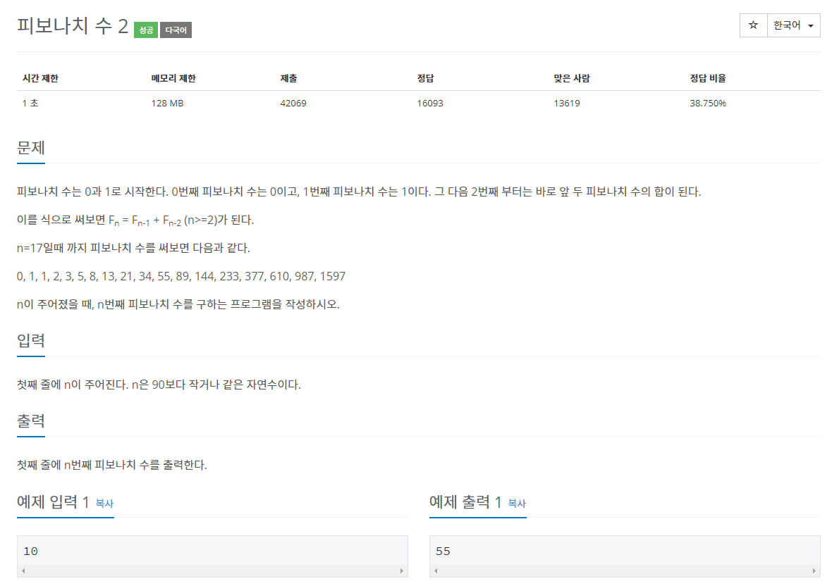 # 보통 피보나치 수열을 재귀적으로 구현할 때 n의 값을 하나씩 감소시키며 값을 구한다. 그러나 이럴 경우 중복되는 계산의 양이 많아지므로 구하고자 하는 숫자가 커질 때 많은 시간을 필요로 한다. 이를 해결하기 위해 가장 작은 수에서부터 역으로 올라가는 bottom-up 방식으로 구현하였다.