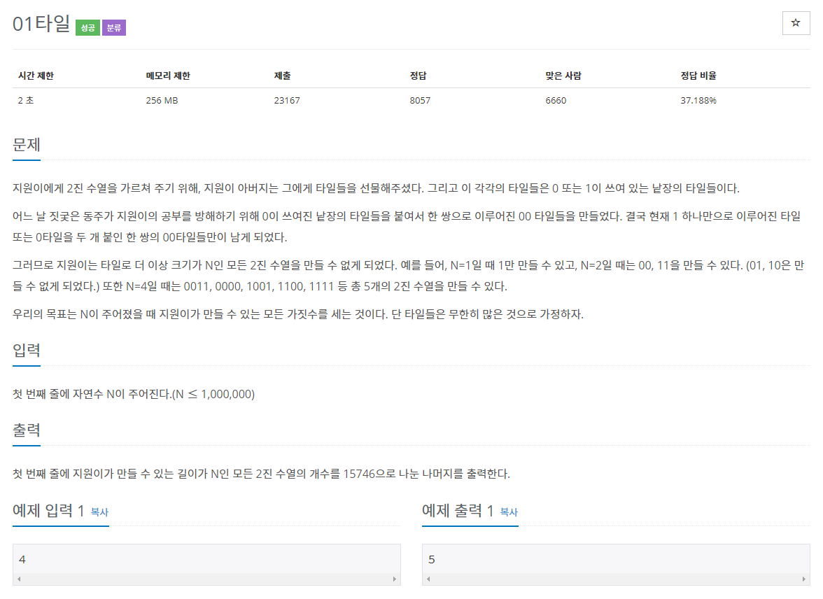N을 1부터 차례대로 구해보면 피보나치와 같은 점화식이 나오는 것을 확인할 수 있다. 이 때 N이 커질 경우 결과값이 정수범위를 초과하는데 이를 방지하기 위해 15746으로 구한 나머지를 저장한다. 나머지를 미리 구한 뒤 계산을 해도 결과값에는 차이가 없다.