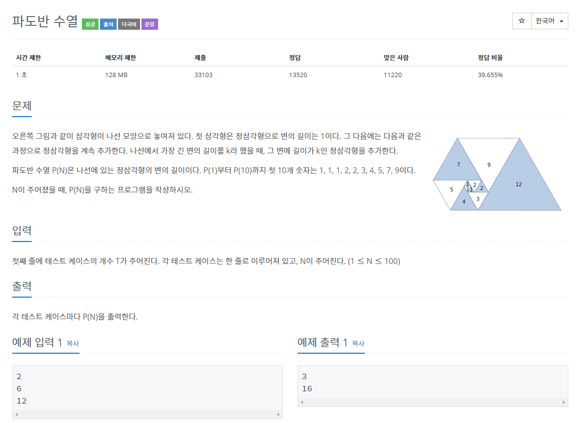 # 새롭게 그려지는 삼각형의 한변의 길이는 이전 삼각형과 다섯번째 전 삼각형의 변의 길이의 합과 같다.