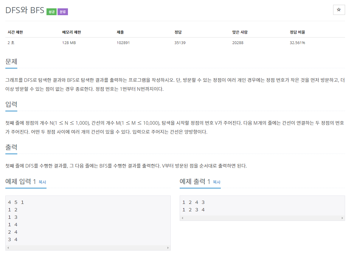 1 2 3 4 5 6 7 8 9 10 11 12 13 14 15 16 17 18 19 20 21 22 23 24 25 26 27 28 29 30 31 32 33 34 35 36 37 38 39 40 41 42 | import sys def dfs(start): # 재귀 if len(visited) == N: return if start in visited: return else: visited.append(start) for node in nodes: if node[0] == start: dfs(node[1]) return visited def bfs(start): # queue visited = [] queue = [start] while queue != []: start = queue.pop(0) visited.append(start) for node in nodes: if node[0] == start and node[1] not in visited and node[1] not in queue: queue.append(node[1]) return visited N, M, V = list(map(int, sys.stdin.readline().strip().split())) nodes = [] for line in range(M): a, b = list(map(int, sys.stdin.readline().strip().split())) nodes.append([a, b]) nodes.append([b, a]) nodes = sorted(nodes, key=lambda x: (x[0], x[1])) visited = [] print(*dfs(V)) print(*bfs(V)) | cs |