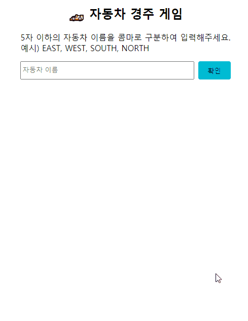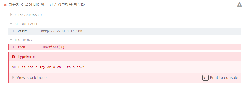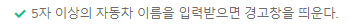본인이 작성한 테스트 코드는 alert를 정확히 테스트하지 못했다. 예를 들어, 자동차 입력 칸에 아무 내용도 없이 확인 버튼이 클릭 됐을 때, 의도한대로 프로그램이 동작하기 위해선 '자동차 이름을 1~5 글자 이내로 입력해주세요!'와 같은 경고창을 띄워야한다. 그러나 위의 코드는 아래의 코드처럼 버튼을 클릭하는 과정을 생략해도 정상적으로 테스트를 통과하게 된다. 그 이유는 alert가 뜨는지 여부를 체크하는 것이 아니라 alert가 떴을 때, alert message가 내가 원하는 대로 출력되는지를 확인하는 코드이기 때문이다. 즉, alert message가 기대하는 것과 다를 때만 에러를 알려준다. alert가 안 뜬 경우는 무조건 통과한다...