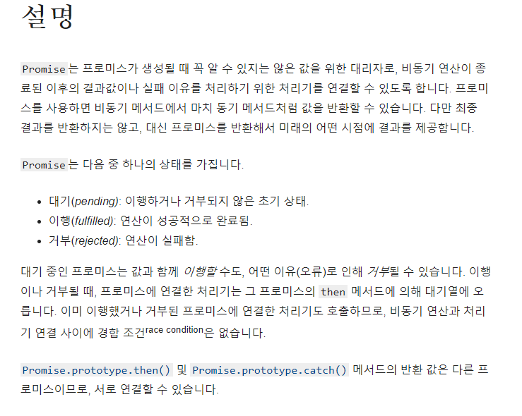 Promise에서 비동기 연산이 정상적으로 처리되면 resolve를 반환한다. resolve가 반환된 프로미스의 경우 .then이나 await을 사용하여 동기적으로 처리가 가능하도록 만들 수 있다. 반면 중간에 오류가 발생한 경우에는 reject를 반환한다. 이는 catch문을 통해 처리할 수 있다.