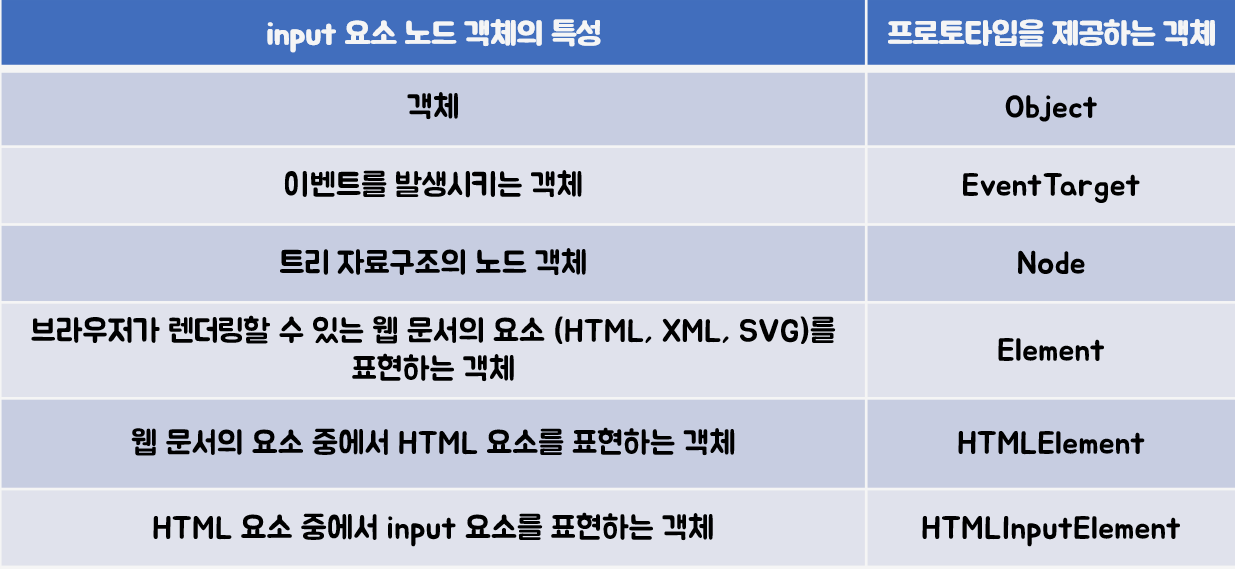 노드 객체도 자바스크립트의 객체이므로 프로토타입에 의한 상속 구조를 갖습니다. 지금 보시는 그림과 같이 모든 노드 객체는 Object, EventTarget, Node 인터페이스를 상속 받습니다. 여기서 eventTarget은 이벤트와 관련된 예를들어 addEventListenter와 removeEventListener 등과 같은 기능을 제공합니다. 따라서 사실상 모든 HTML 요소에 eventListenter를 추가할 수 있습니다. 또, parentnode나 childNodes 등과 같은 노드 관련 기능은 Node 인터페이스가 제공합니다. 이를 좀 더 쉽게 이해하기 위해서 input 요소를 예로 들어보겠습니다.
