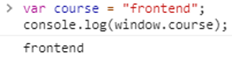 여기서 Window 객체는 자바스크립트의 최상위 객체이자 전역 객체이면서 모든 객체가 소속된 객체입니다. 주목할만한 점은 var 키워드로 선언한 일반 변수도 모두 window 객체의 속성이 됩니다. 밑의 코드를 보면 var 키워드로 선언한 course에 frontend를 할당했습니다. 그런데 window.course로 콘솔을 찍어도 정상적으로 출력되는 것을 확인할 수 있습니다.