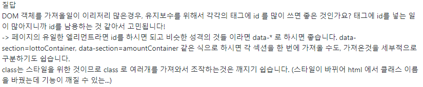 물론, data 속성을 이용해 DOM 노드를 가져올 수 있다. 그러나, 개인적으로 data 속성은 DOM을 조회하기 위한 속성이 아니라 이름 그대로 data에 대한 내용을 저장하기 위한 목적이라고 생각한다. 이에 대해 파노가 아주 좋은 링크를 소개해주었다. (파노 갓...) Airbnb 스타일 가이드에서는 자바스크립트를 위한 클래스명에 'js-'라는 prefix를 붙이는 것을 권장한다고 한다.