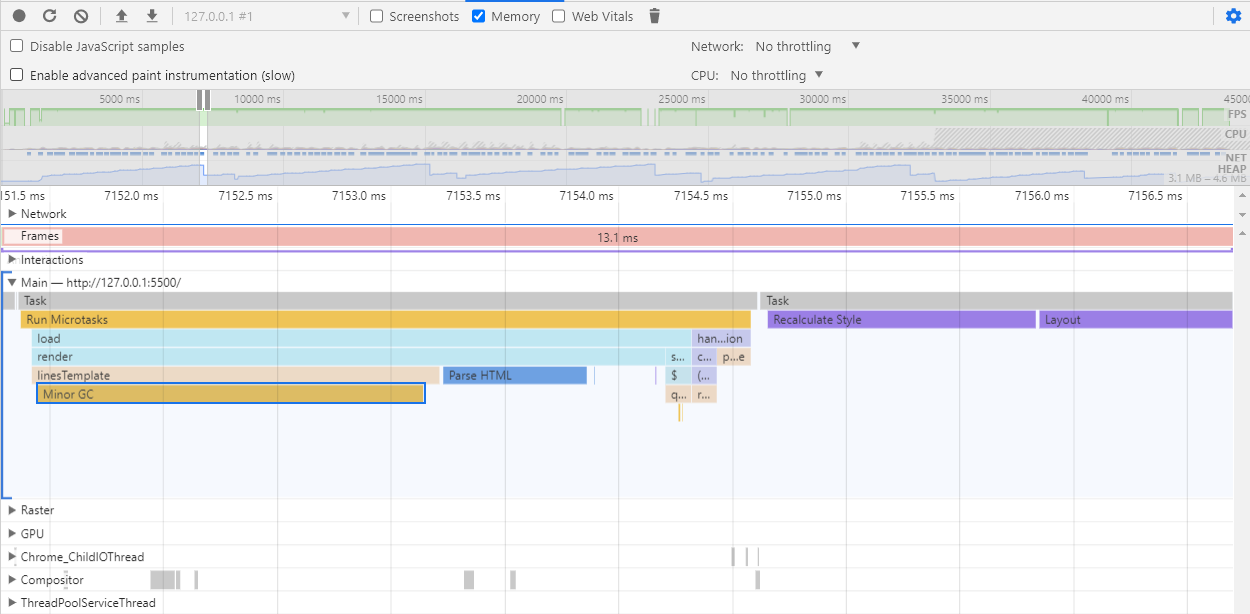 탭을 열심히 바꿔갈 때마다 메모리가 점점 올라가는 것이 보인다. 만약 메모리 누수가 발생했다면 그래프가 우상향한다. 하지만 일정 시간이 지나면 메모리가 GC에 의해 다시 확보되는 것을 확인할 수 있다.